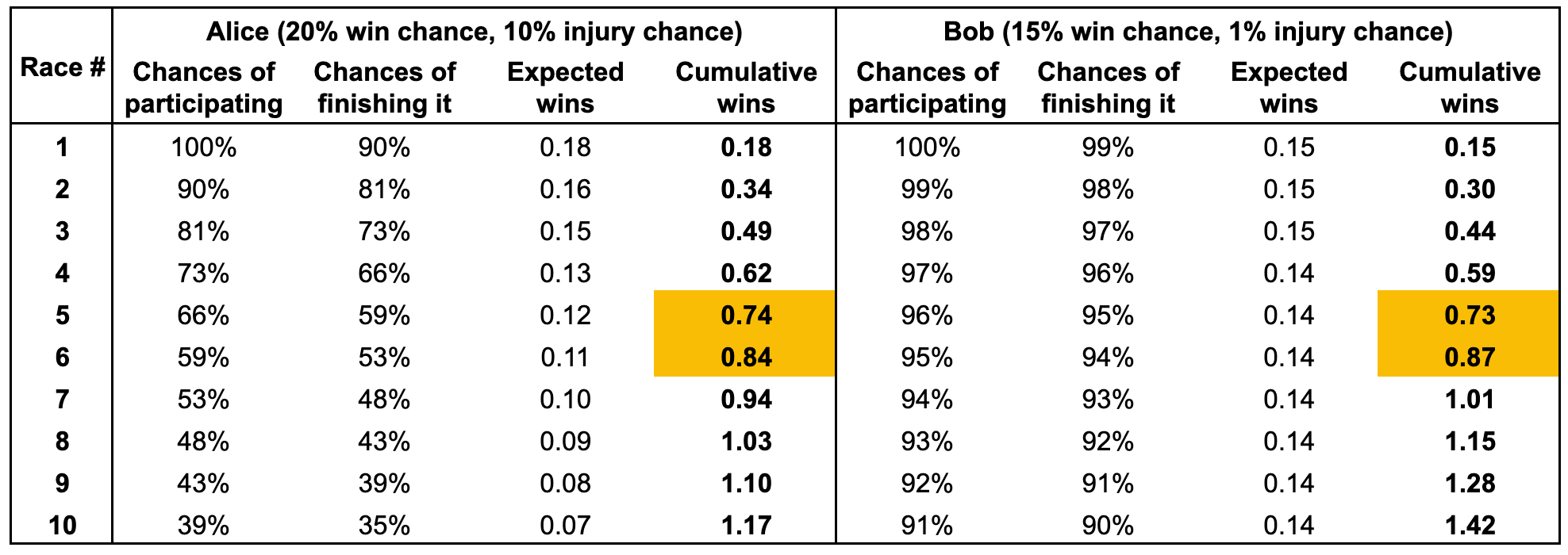 Imagine two cousins who both love skiing, Alice and Bob, who decide to participate in a skiing championship. They have the same skill level and fitness, but with one difference. Alice takes more risks, so she has a 20% chance of winning each race and a 10% chance of injuring herself. Conversely, Bob is more risk conservative, so his chances of winning each race are lower, 15%, but his chances of injury are also lower, 1%. Which skier wins the most races?