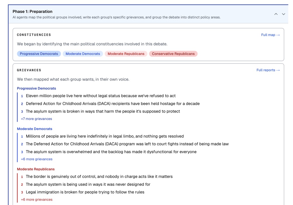 First, it creates agents that represent major voting blocs (for example, Progressive Democrats, Moderate Democrats, Moderate Republicans, and Conservative Republicans). Each agent lists its group’s grievances with the current policy, in the language that group actually uses: what feels unfair, what feels broken, what trade-offs they refuse, what outcomes they care about.